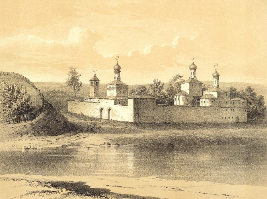 Литография с видом Андреевского монастыря со стороны реки. Из издания "Русская старина в памятниках церковного и гражданского зодчества", выпущенного А. А. Мартыновым в 1857 году.