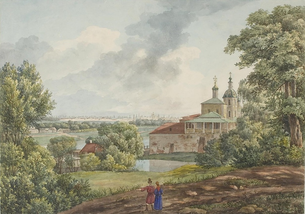 Акварель "Вид Андреевского монастыря в окрестностях Москвы". Художник О. Кадоль. 1827 год.